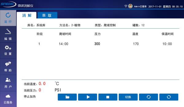 TANK PLUS使用ucos+安卓操作系統(tǒng) 運(yùn)行穩(wěn)定可靠,采用7寸液晶彩色觸摸屏,觸控操作流暢簡(jiǎn)便。頁(yè)面實(shí)時(shí)顯示工作狀態(tài)及溫壓變化曲線。內(nèi)置專(zhuān)家方法庫(kù),可自行編輯及存儲(chǔ)用戶(hù)方法,也可以從云服務(wù)方法庫(kù)下載其他共享方法。內(nèi)置COT實(shí)時(shí)溫壓異常監(jiān)控系統(tǒng)能夠在任何一個(gè)反應(yīng)罐出現(xiàn)溫壓異常時(shí)自動(dòng)報(bào)警并切斷微波從而保護(hù)儀器安全。裝有內(nèi)部攝像頭可實(shí)時(shí)監(jiān)控爐腔內(nèi)消解罐運(yùn)行情況。